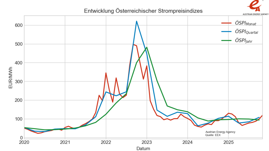 Der Strompreisindex auf Monatsbasis (ÖSPIMonat) steigt im November 2025 gegenüber dem Vormonat um 20,3 %. Im Vergleich zum November 2024 liegt der Index um 20,4 % höher. Der Index liegt bei einem Wert von 119,61 EUR/MWh.