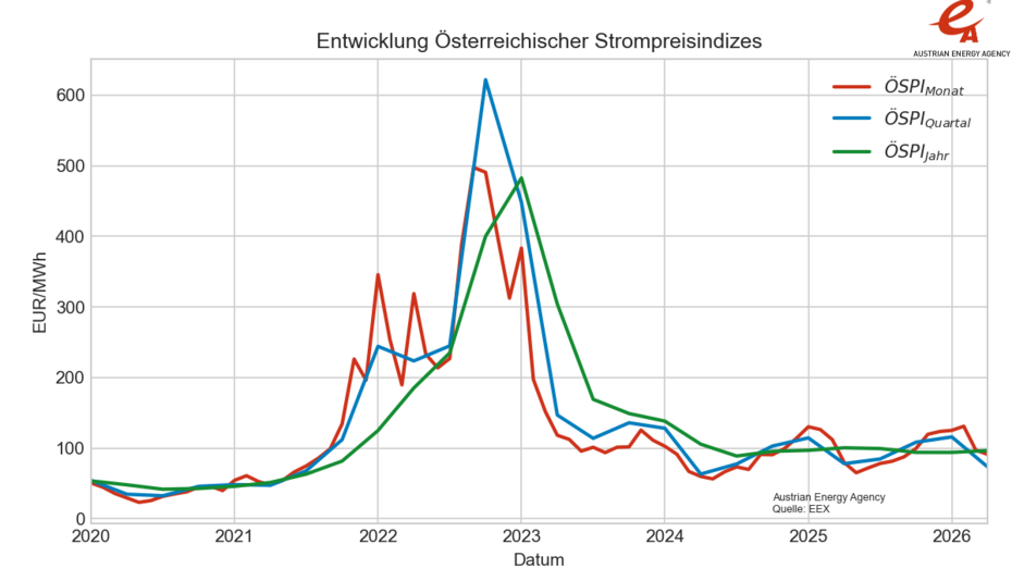 Der Strompreisindex auf Jahresbasis (ÖSPIJahr) steigt im April 2026 gegenüber dem Jänner 2026 um 2,6 %. Im Vergleich zum April 2025 liegt der Index um 4,0 % niedriger. Der Index liegt bei einem Wert von 96,39 EUR/MWh.