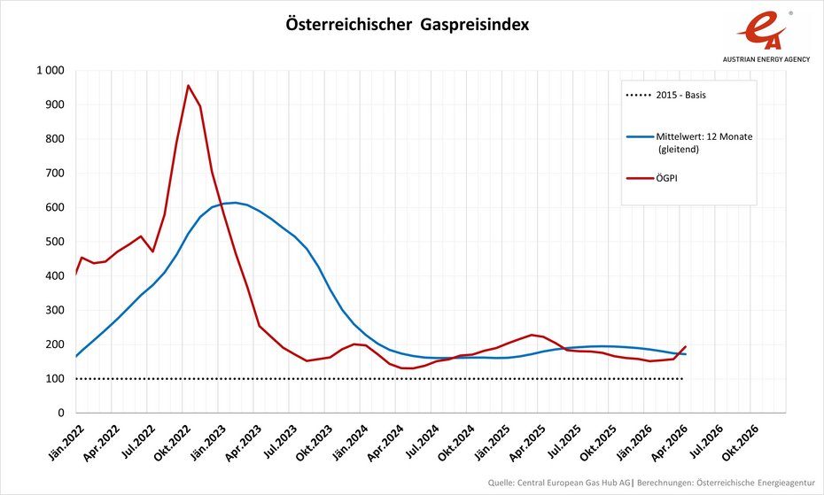 Wien, 27. März 2026 – Der Österreichische Gaspreisindex (ÖGPI) steigt im April 2026 im Vergleich zum Vormonat März um 22,9 %. Gegenüber April 2025 liegt er um 13,1 % niedriger. Der von der Österreichischen Energieagentur berechnete Index steigt im April 2026 auf 193,33 Punkte. In den vergangenen zwölf Monaten lag der ÖGPI im Schnitt bei 172,02 Punkten.